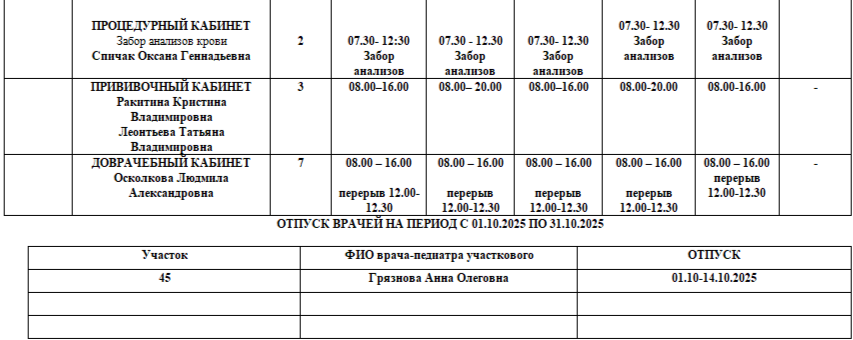 Расписание на 01.10.2025. Возможны изменения в связи с периодом отпусков, листами нетрудоспособности специалистов и прочим причинам.