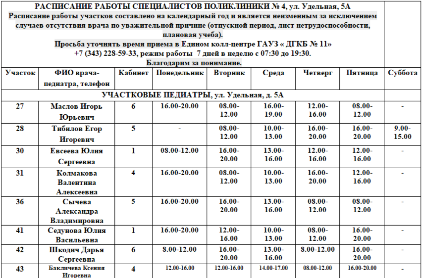 Седунова Юлия Васильевна, участок № 41. Диплом по специальности "Педиатрия", ФГБОУ ВО "УГМУ", 2024. Аккредитация по специальности «Педиатрия» до 08.07.2029, стаж 6 месяцев.
