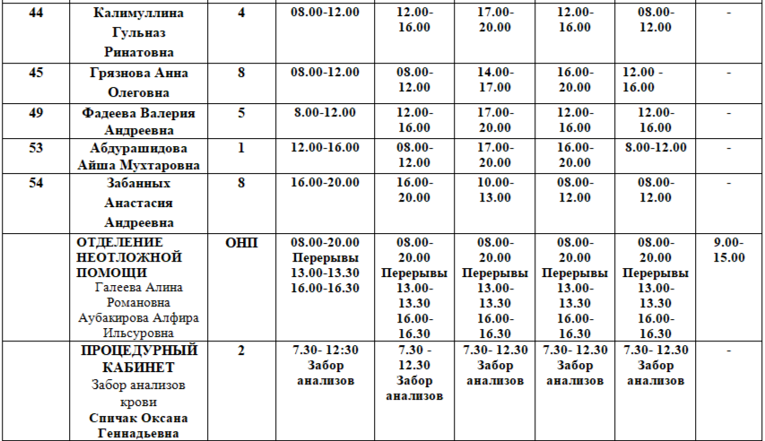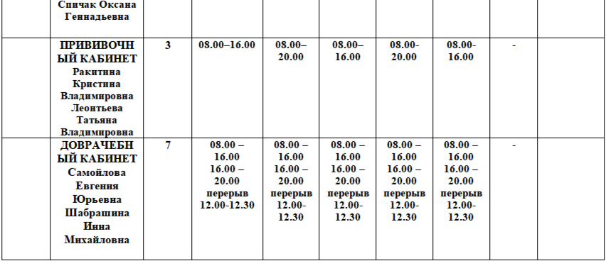 Кабинет доврачебного приема: пн, вт, чт - 08:00-15:45, обед 12:00-12:30, ср, пт 8:00-19:30, обед 12:00-12:30, 16:00-16:30