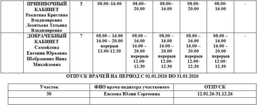 Расписание на 12.01.2026. Возможны изменения в связи с периодом отпусков, листами нетрудоспособности специалистов и прочим причинам.
