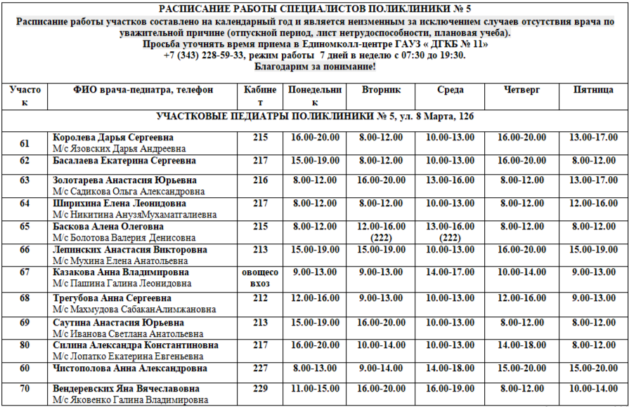 Расписание работы участков может меняться. Часы приема специалистов лучше всего уточнять по телефону колцентра: +7(343) 228-59-33