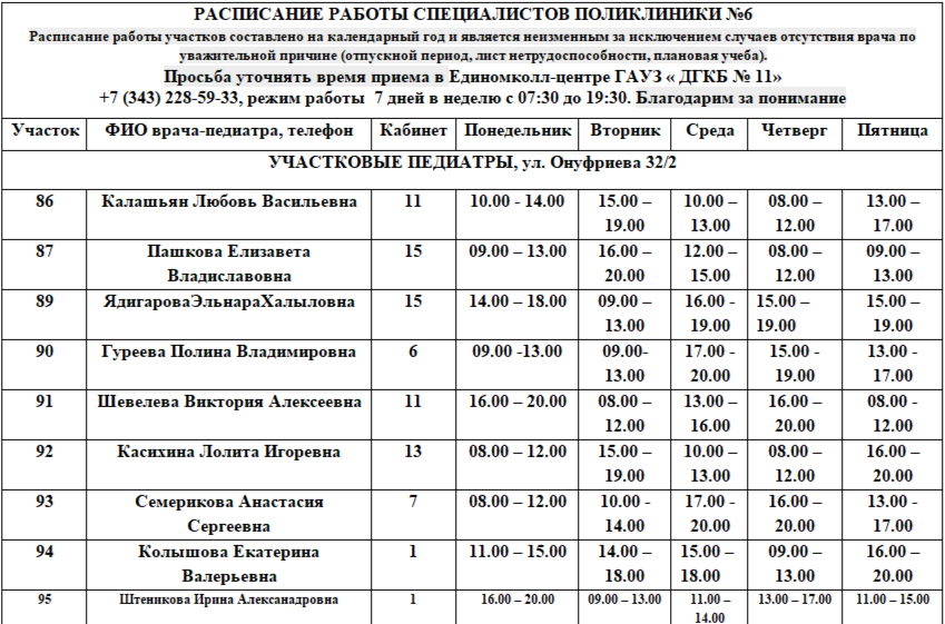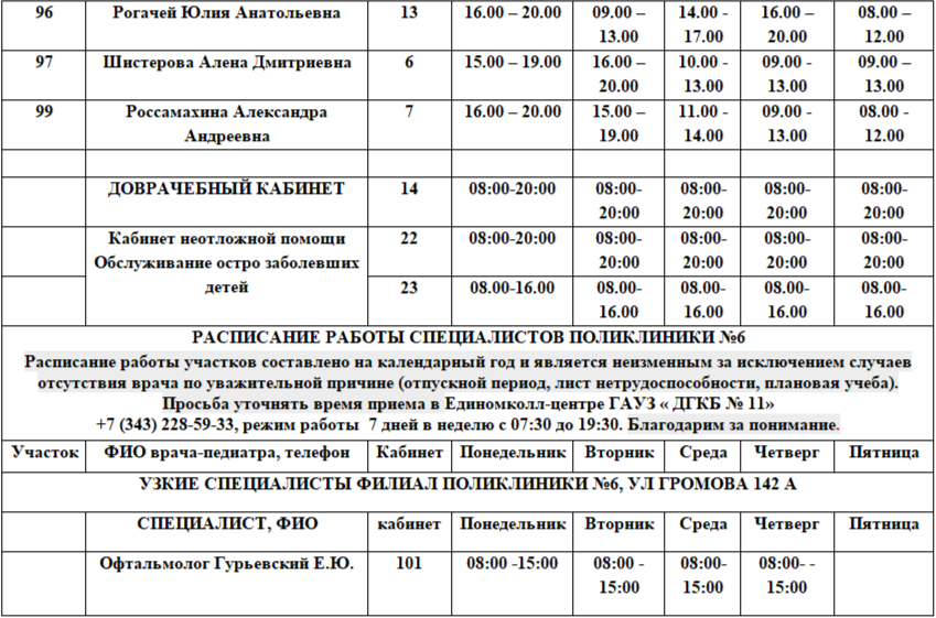 Расписание работы участков может меняться. Часы приема специалистов лучше всего уточнять по телефону Единого колл-центра больницы: +7(343) 228-59-33.