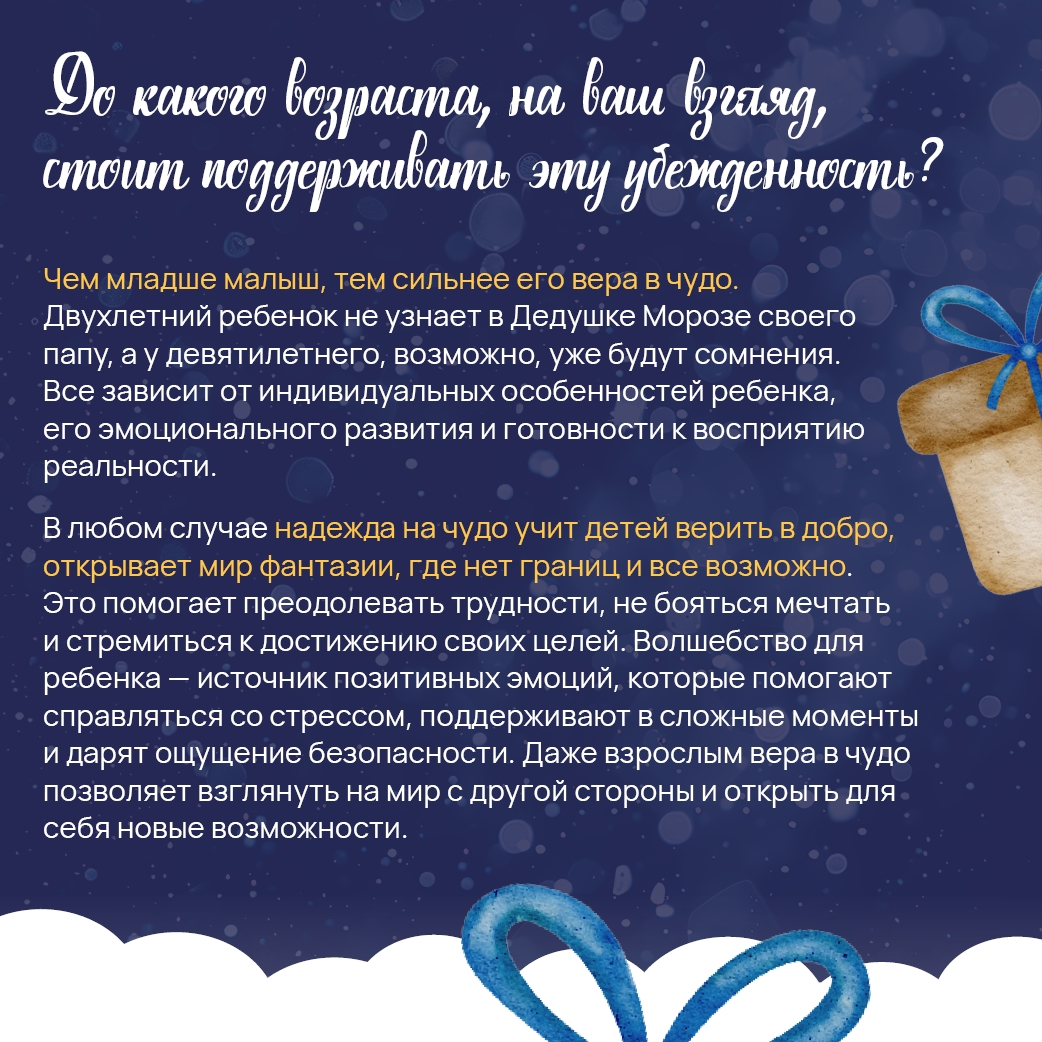 На эти и другие вопросы отвечает психолог Детской городской клинической больницы № 11 Екатеринбурга Марина Пометелина, а также рассказывает, как вера в чудо влияет на наше психоэмоциональное состояние. Скорее смотрите карточки.